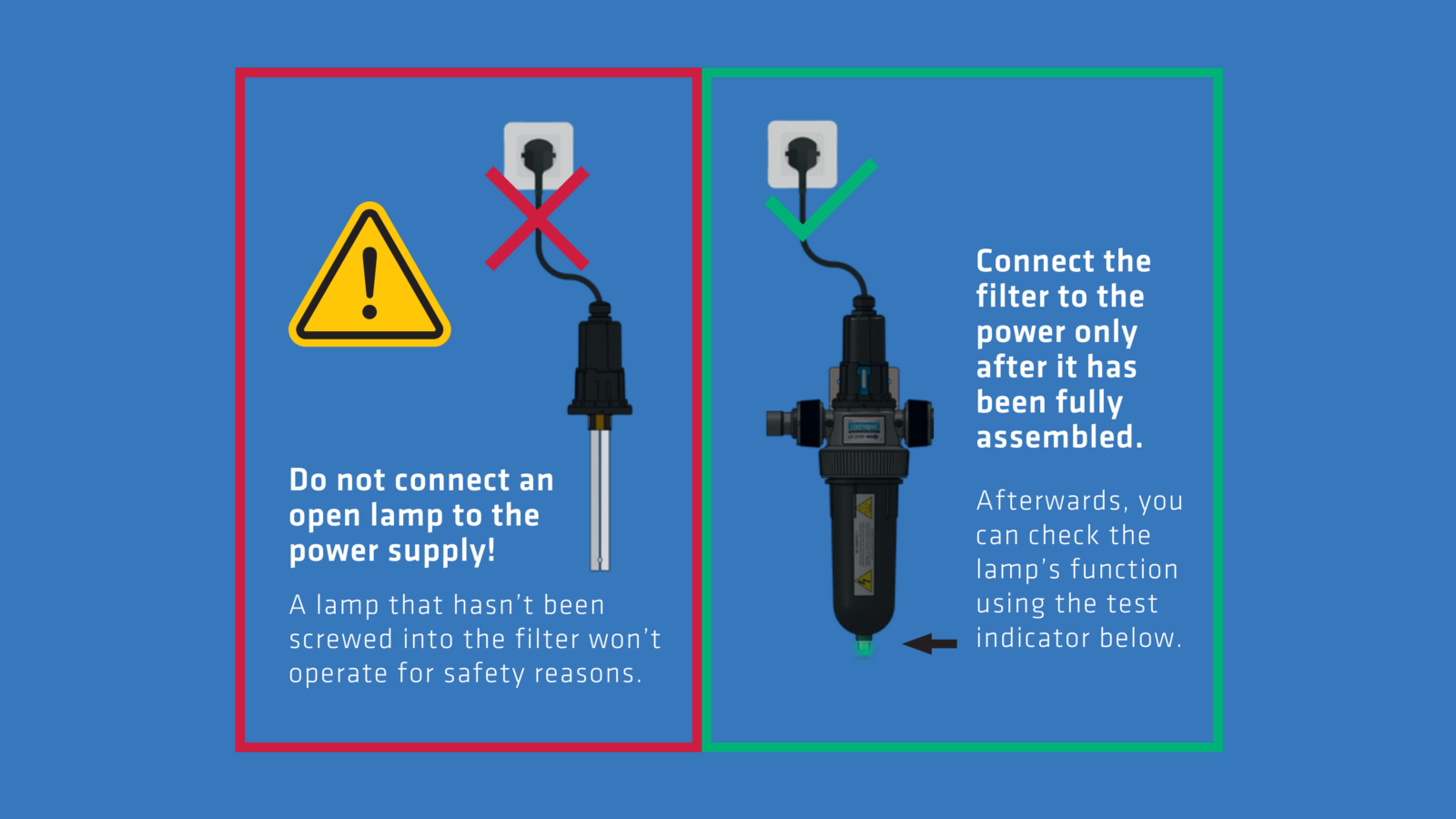 ✔ Aus Sicherheitsgründen darf die UV-Lampe niemals an die Stromversorgung angeschlossen werden, solange sie nicht vollständig im Filter montiert ist. Die Lampe funktioniert erst, wenn sie korrekt eingesetzt und fixiert wurde. Schließen Sie den Filter erst nach vollständiger Montage an das Stromnetz an und überprüfen Sie anschließend die Funktion mithilfe der Testanzeige.