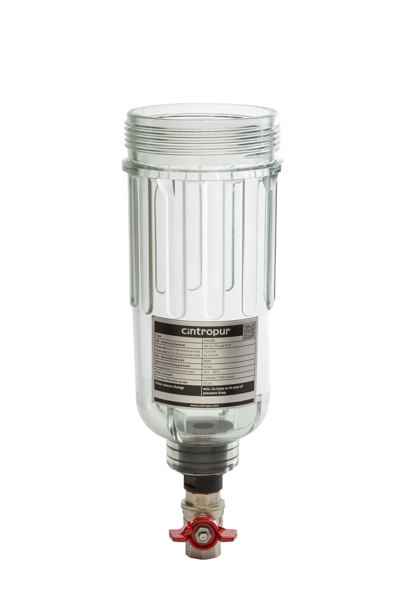 Cloche transparente pour un contrôle visuel permanent de l'encrassement du tamis filtrant. Livrée de série assemblée avec un adaptateur et une vanne à bille 1/2''.