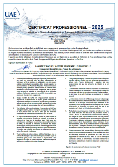 Durch die Verbindung seiner Charta des gesellschaftlichen Engagements mit dem UAE-Berufszertifikat bietet das Unternehmen Fachleuten der Wasseraufbereitung eine starke Garantie: die eines zuverlässigen, verantwortungsvollen und zukunftsorientierten Partners.
