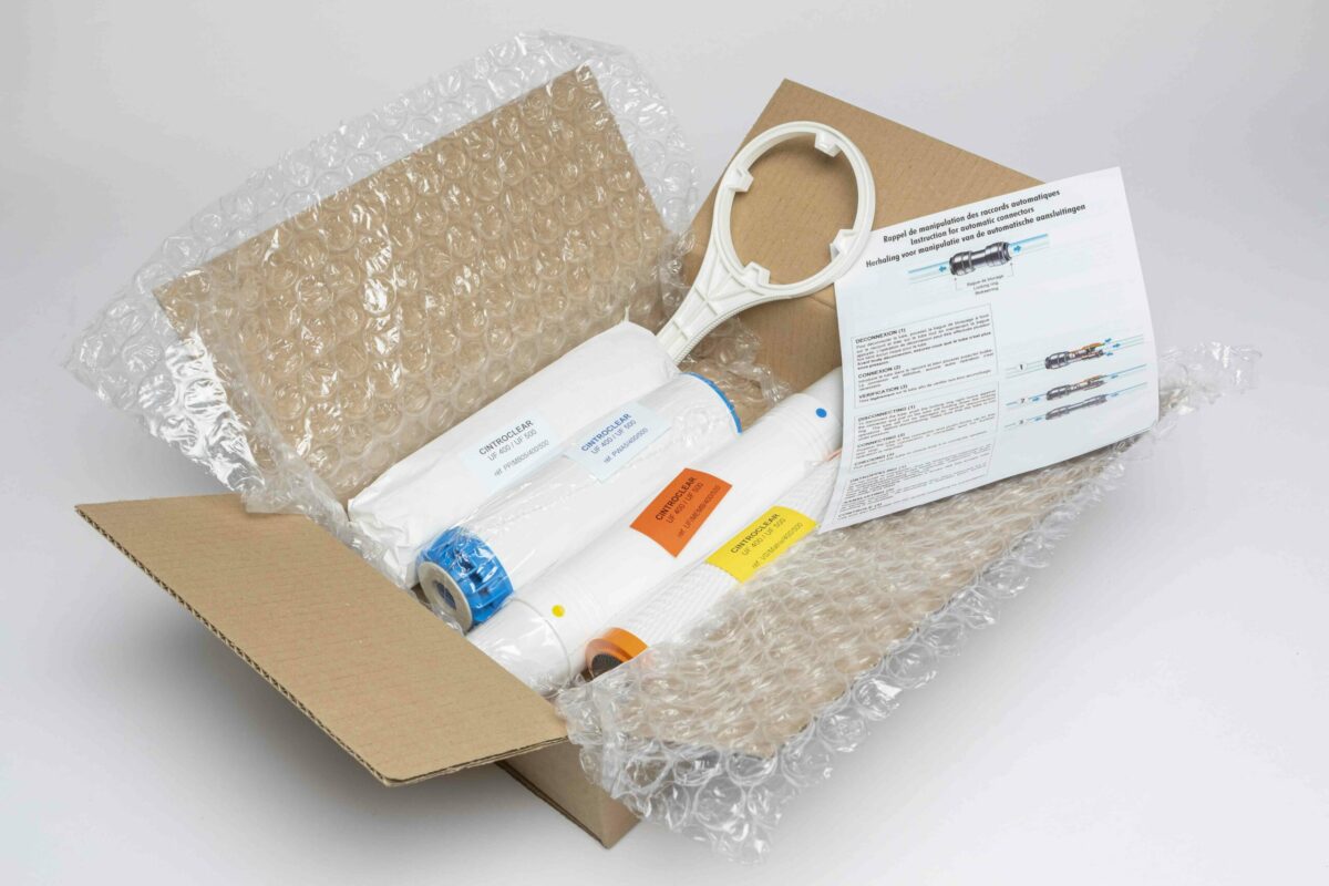Das Unterhaltskit enthält 4 Kartuschen Vorfilterkartusche 5µ, Aktivkohlekartusche, Denitrierungskartusche und eine Ultrafiltrationskartusche. Nur die UV Lampe muβ bei Bedarf zusätzlich bestellt werden, nur für den UF 500.